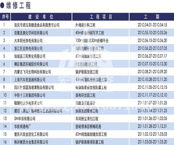 宏順建設(shè)工程有限公司是國(guó)家批準(zhǔn)成立的專(zhuān)業(yè)高空作業(yè)企業(yè):承攬過(guò)(國(guó)內(nèi).國(guó)外)煙囪新建、煙囪防腐、磚煙囪新建、煙囪改造、煙囪維修、煙囪脫硫防腐、煙囪拆除加高、煙囪滑膜等高空作業(yè)工程。具有“不搭腳手架 、 不需要停產(chǎn)”施工特點(diǎn)。